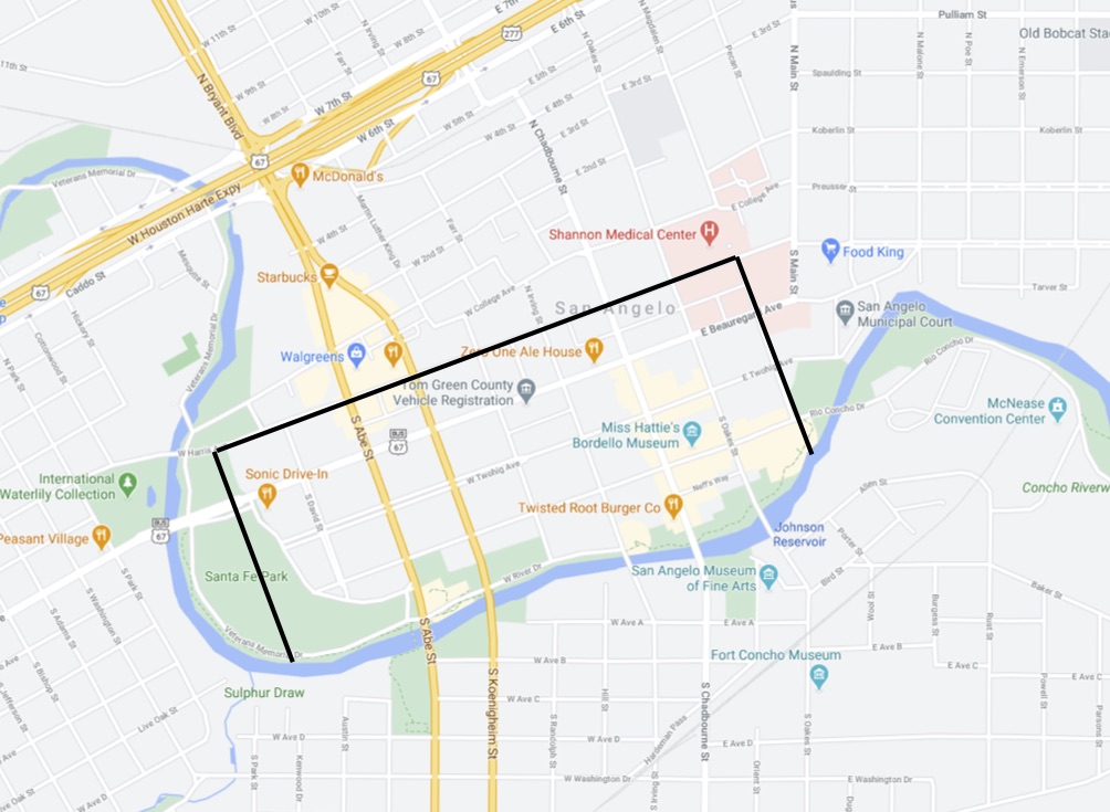 The original townsite of Santa Angela depicted by the black lines overlaid on current map of the City of San Angelo.